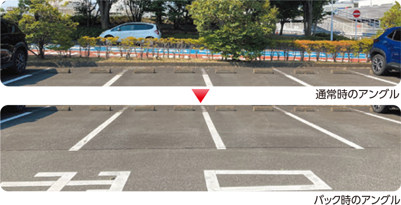 付属するリバース連動線を接続することで、車両後退時に自動的に下向きの角度に液晶表示のアングルが切り替わります。バックカメラの補助的な役割にもなります。