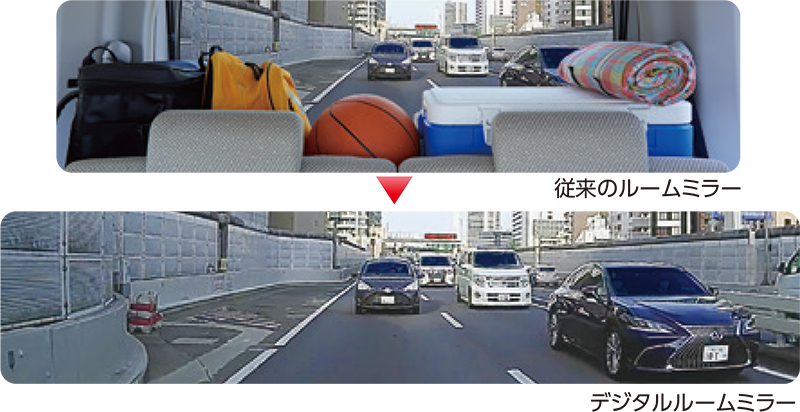 従来のルームミラーとデジタルルームミラーの後方視界の違い
