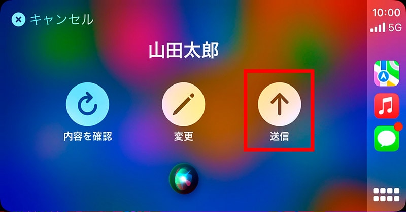 Siri との会話に沿って、返信するメッセージを読み上げにより、送信するメッセージの内容を確認し、送信するか、「送信」アイコンをタップすることでメッセージが送信されます。