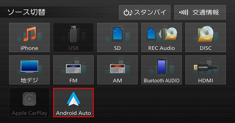 スマートフォンと接続後に、ワイド スタンダード ナビのメニュー画面上で「Android Auto 」アイコンの枠が点灯すると使用可能になります。