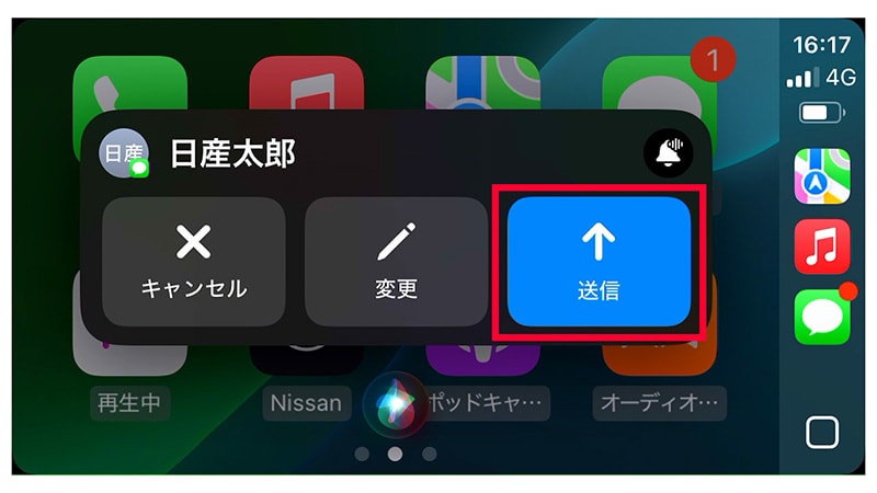 Siriとの会話に沿って、返信するメッセージを読み上げにより、送信するメッセージの内容を確認し、送信するか、「送信」アイコンをタップすることでメッセージが送信されます。