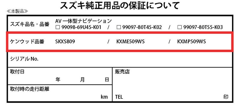 赤枠ケンウッド品番内に「KXMP509WS」の記載がある場合