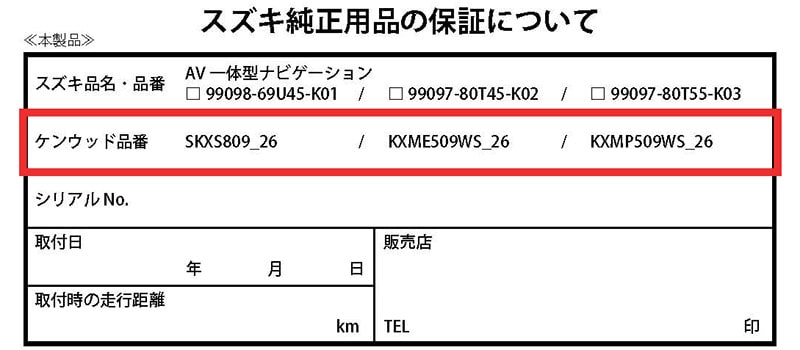 赤枠ケンウッド品番内に「KXMP509WS_26」の記載がある場合