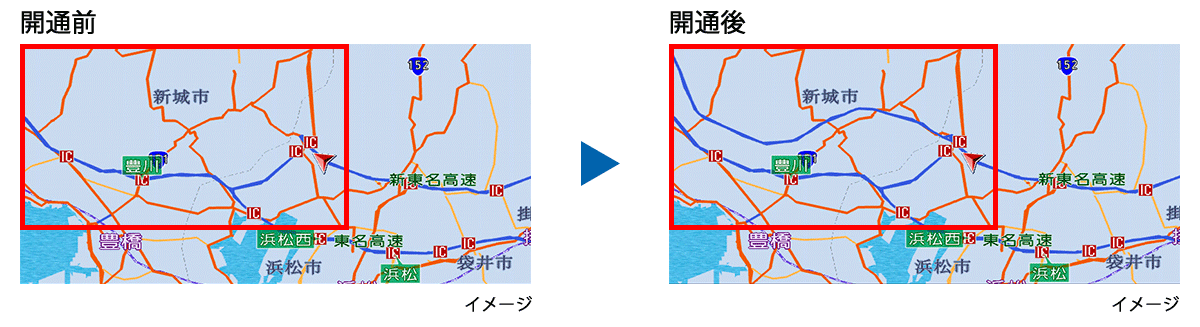 高速道路などの高規格道路は、建設に複数年要することから、開通の約1年前には路線やICの形状や位置は、ほぼ確定しています。そこで、ナビゲーションの発売後に開通する予定の路線を、あらかじめ開通予定データとして格納し、発売後に予定通り開通されることで、事前格納された路線データを使えるように更新データをアップデートします。表示はもちろんルート検索にも対応できるようになります。