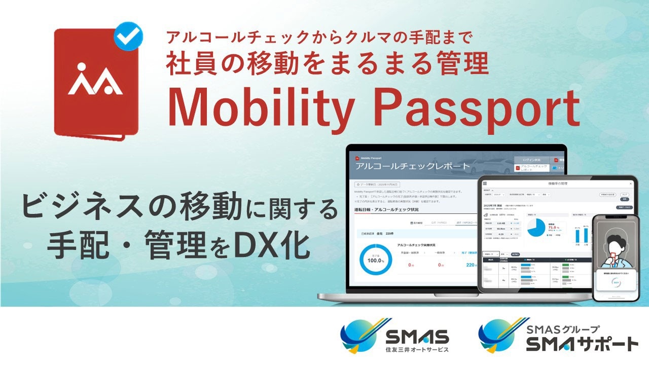Mobilty PassportはSMAS(住友三井オートサービス株式会社)グループが提供する車両管理クラウドサービスです。社用車の予約、レンタカーの手配、運転日報の作成・管理、アルコールチェックの記録、運転免許証の管理、社用車の稼働管理まで、社員の移動に関する業務をたった1つのアプリで完結。スマホ・タブレット・PCなど、どのデバイスからでもご利用が可能です。