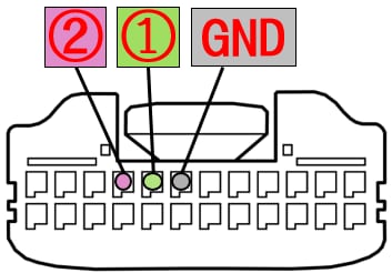 ステアリングリモコンアダプターの①、②、GND端子を、左図に示す各端子に接続されている取付キットのステアリングリモコン線に接続してください。