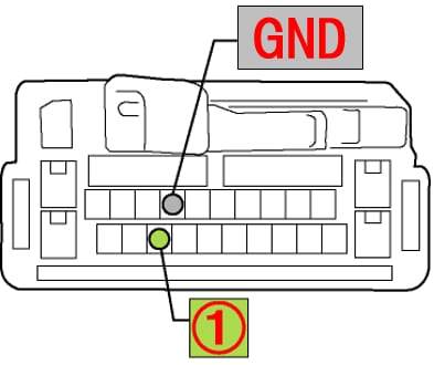 ステアリングリモコンアダプターの①、GND端子を、左図に示す各端子に接続されている取付キットのステアリングリモコン線に接続してください。