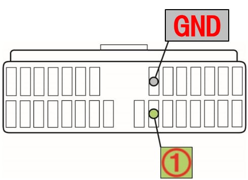 ステアリングリモコンアダプターの①、GND端子を、左図に示す各端子に接続されている取付キットのステアリングリモコン線に接続してください。