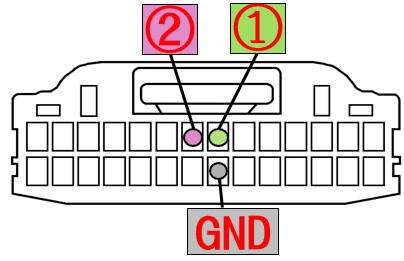 ステアリングリモコンアダプターの①、②、GND端子を、左図に示す各端子に接続されている取付キットのステアリングリモコン線に接続してください。