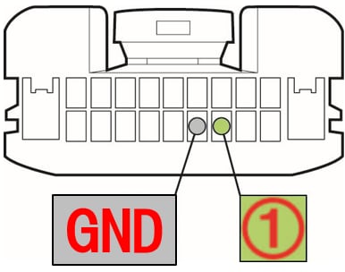 ステアリングリモコンアダプターの①、GND端子を、左図に示す各端子に接続されている取付キットのステアリングリモコン線に接続してください。