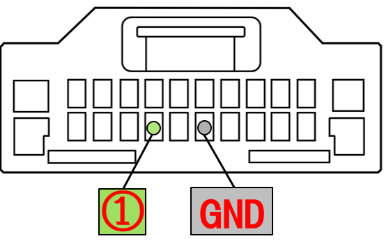 ステアリングリモコンアダプターの①、GND端子を、左図に示す各端子に接続されている取付キットのステアリングリモコン線に接続してください。