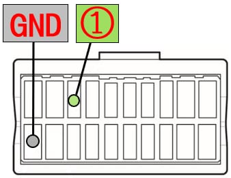 ステアリングリモコンアダプターの①、GND端子を、左図に示す各端子に接続されている取付キットのステアリングリモコン線に接続してください。