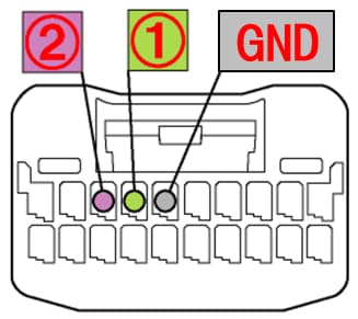 ステアリングリモコンアダプターの①、②、GND端子を、左図に示す各端子に接続されている取付キットのステアリングリモコン線に接続してください。