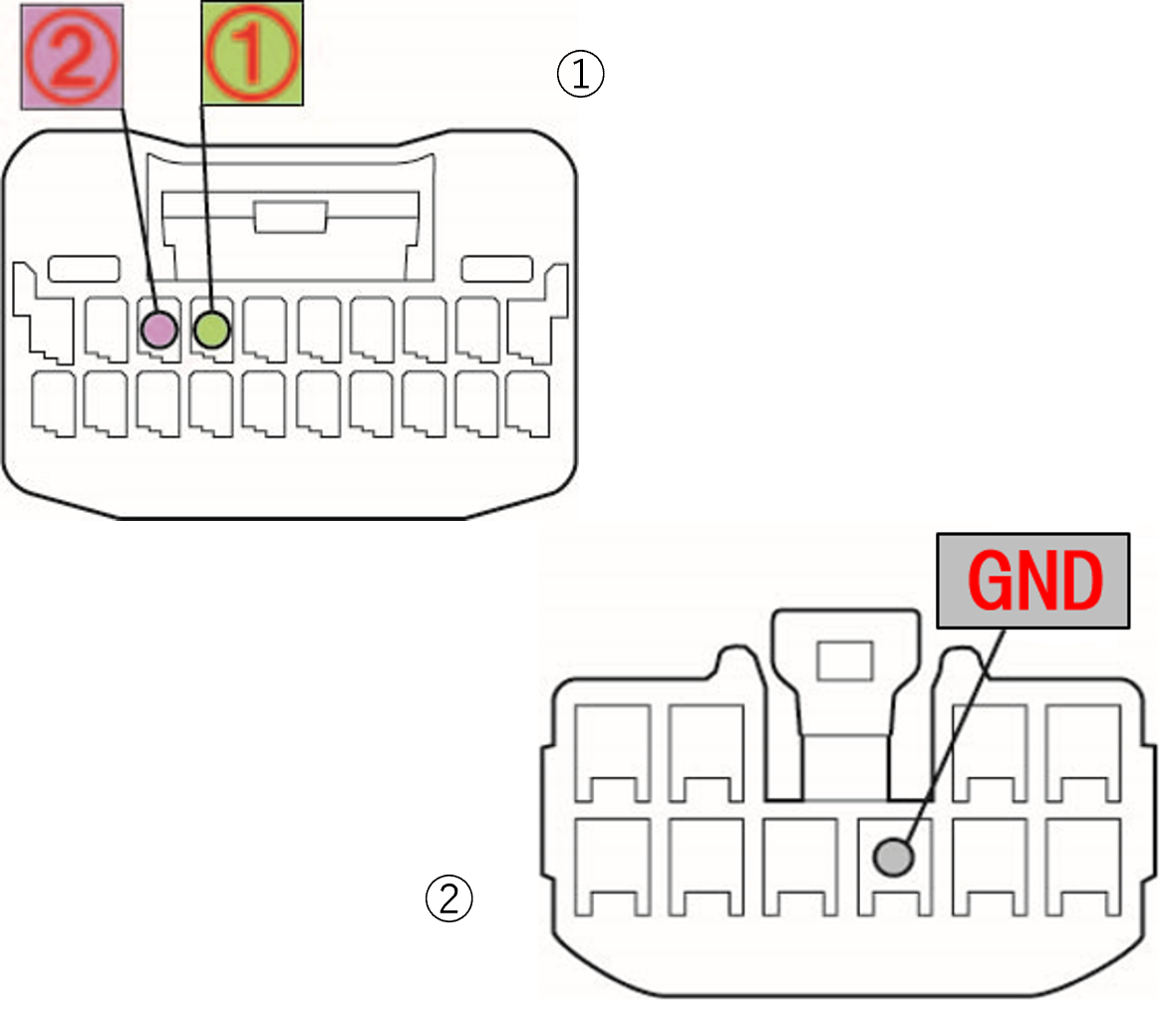 ステアリングリモコンアダプターの①、②、GND端子を、左図に示す各端子に接続されている取付キットのステアリングリモコン線に接続してください。