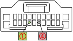 ステアリングリモコンアダプターの①、④端子を、左図に示す各端子に接続されているケーブルそれぞれに、中継コネクタを用いて接続します。