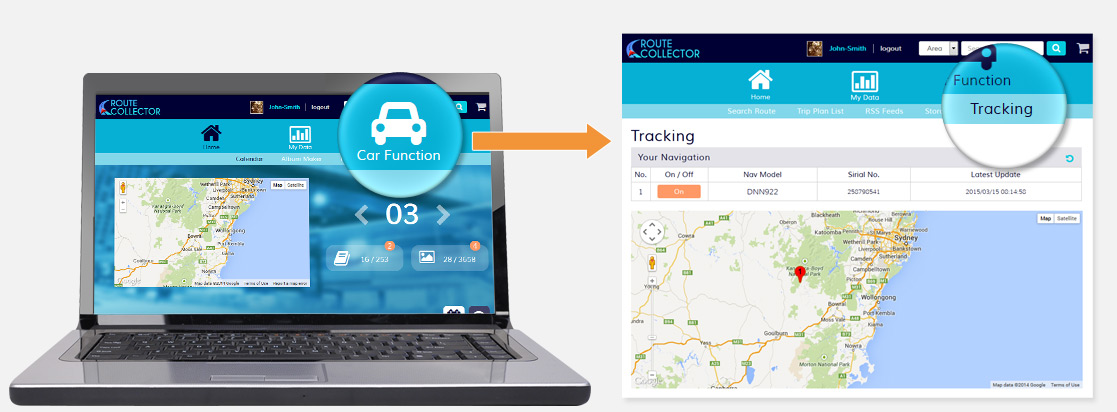 Also, it may help you search your car when it's stolen*. If the power is on, DNN will connect to the network and you will be able to know where the car is, by your smartphone or PC. Route Collector