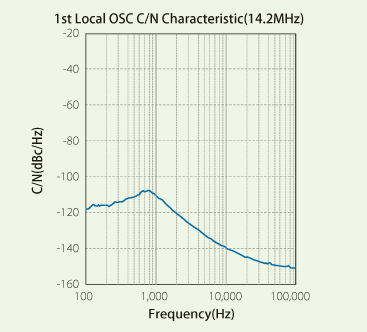 第一局発は、通常のPLL/VCO方式ではな く、DDS(ダイレクト・デジタル・シンセサイザー)の出力を直接ミキサーに供給する方式です。ダウンコンバージョン時には発振周波数がアップコンバージョン時よりも低くなるため、さらに優れたC/N特性を実現できます。これにより、受信信号に近接する大入力信号によるレシプロカルミキシング特性が改善されます。