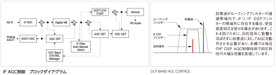 「長時間のコンテストでも聞き疲れがしない」と定評のあるケンウッドの受信音は、独自のDSPアルゴリズムによるIF AGC技術によって決定されていると言っても過言ではありません。本機にはケンウッドのIF DSP AGC技術を余すことなく投入。アナログAGC回路も一新することで、小入力から大入力まで優れたAGC特性を実現しています。ルーフィングフィルターと最終的な選択度を決定するIFDSPフィルターの狭間に妨害信号があっても、そのレベルに応じた最適なAGC制御により、ルーフィングフィルターの帯域幅を意識することなく運用が可能です。