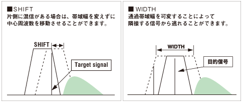 SSB/ AM/ FMモードでは帯域のHI CUT/ LO CUT機能、CW/ FSK/ SSB-DATA通信モードではWIDTH/SHIFT機能として動作します。なお、SSB およびSSB-DATA通信モードではメニューで動作を切替えができます。