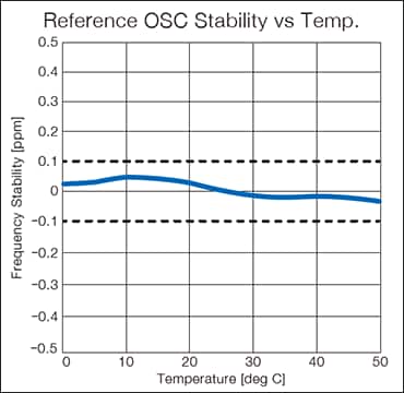 プリヒートが不要なTCXO(温度補償型水晶発振器)を標準搭載することにより、0℃~+50℃の広い温度範囲において±0.1ppmの高い安定度を得ています。また外部の基準信号(10MHz)の入力が可能です。