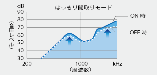 はっきり聞取りモードをオンにすることで受信音の高域を強調。騒音下はもちろん、マスク着用時のこもった音声も聞取りやすくなります。