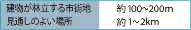見通しのよい場所ほど、遠くと交信しやすくなります。表中の距離は、無線機を手に持って使用した際の目安ですが、無線機の位置や障害物などの諸条件により変化します。なお、アンテナを体から離し高く位置させることで、交信距離は向上します。