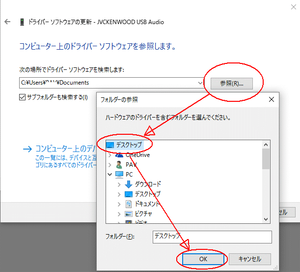 - 4-11. 【参照】をクリックし、一番上のデスクトップ(ドライバーをダウンロードしたフォルダ)を指定し、「サブフォルダも検索する」にチェックを入れてから【次へ】をクリックします。
