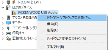 - 4-9. パソコンのデバイスマネージャーの中で、[JVCKENWOOD USB Audio] を右クリックし、「ドライバーソフトウェアの更新」をクリックします。