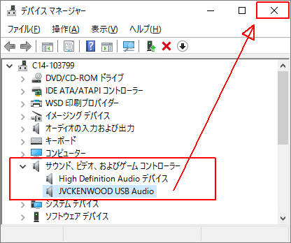 - 4-13. ドライバーのインストールが完了すると、「サウンド、ビデオ、およびゲームコントローラー」の項目に、「JVCKENWOOD USB Audio」という名前があることを確認し、デバイスマネージャーを【×】で閉じます。