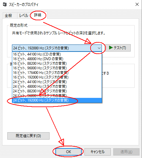 - 5-7.「詳細」タブをクリックし項目から「24ビット 192000Hz(スタジオの音質)」を選択し、【OK】ボタンを押します。