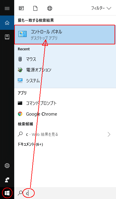 キーボードの【Windows】キーを押し、「c」を入力すると表示される「コントロールパネル」をクリックします。