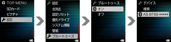 MG-G608のホーム画面 (TOP MENU)を表示させ、“設定” > “ブルートゥース” > “オン” > “AS-BT50-******”を選択します。