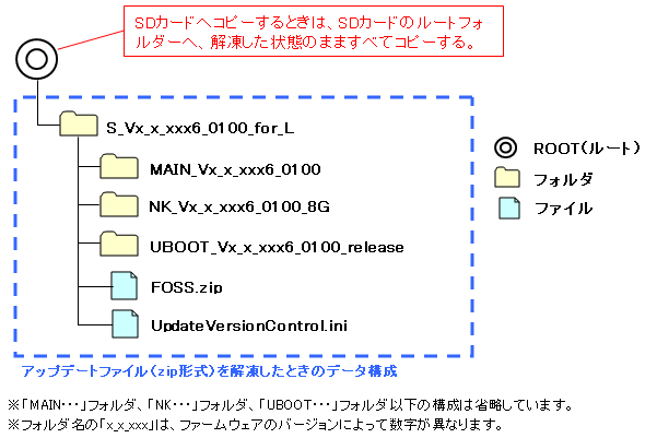 - SDカードには、ダウンロードしたアップデータ以外のフォルダ/ファイルを置かないようにしてください。