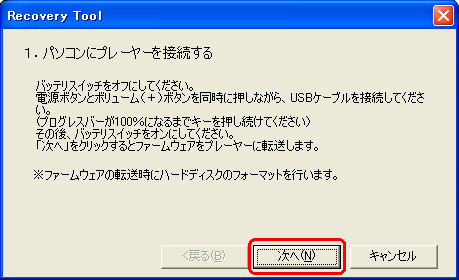 - このリカバリーツールは、起動できなくなったプレーヤーを修復するものです。正常に使用できるプレーヤーにはご使用にならないでください。