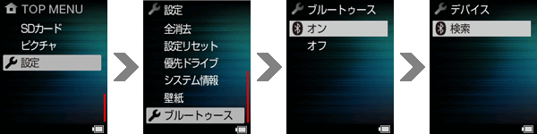 MG-G608のホーム画面 (TOP MENU)を表示させ、“設定” > “ブルートゥース” > “オン” > “検索”を選択します。