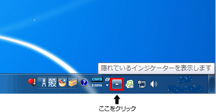 | 1.タスクトレイのインジケーターが隠れている場合は、「隠れているインジケータを表示します」(ここをクリックの部分)をクリックし、表示させてから、[ハードウェアの安全な取り外し]アイコンをクリックします。 | |
