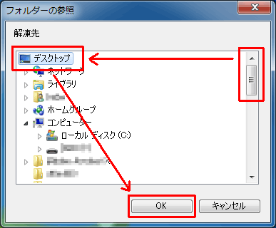 スクロールバーで、一番上の「デスクトップ」を選択し、[OK]ボタンをクリックします。 |