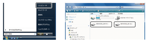 「スタート」>「コンピュータ」>「KENWOOD_DAP」(内蔵メモリ)または、「リムーバブルディスク」/「KENWOOD_SD」(SDカード)を選択します。(「Digital Player」と表示される場合があります。) |