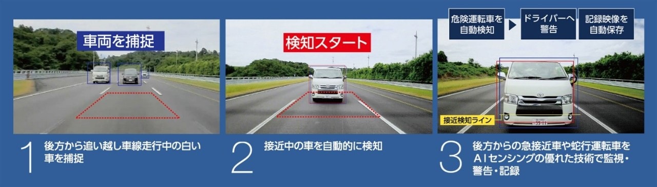 後方からの急接近や蛇行運転などのあおり運転を自動で検知・録画する「AIセンシング」を搭載。後方車両をリアカメラが捕捉し、同機能の検知エリアに侵入すると自動で検知し追尾を開始。さらに検知エリア内で急接近や繰り返しの蛇行運転を検知するとドライバーに警告音と画面表示で知らせるとともに、録画映像を書き換えがされないイベントフォルダに自動的に移動させ、保存します。