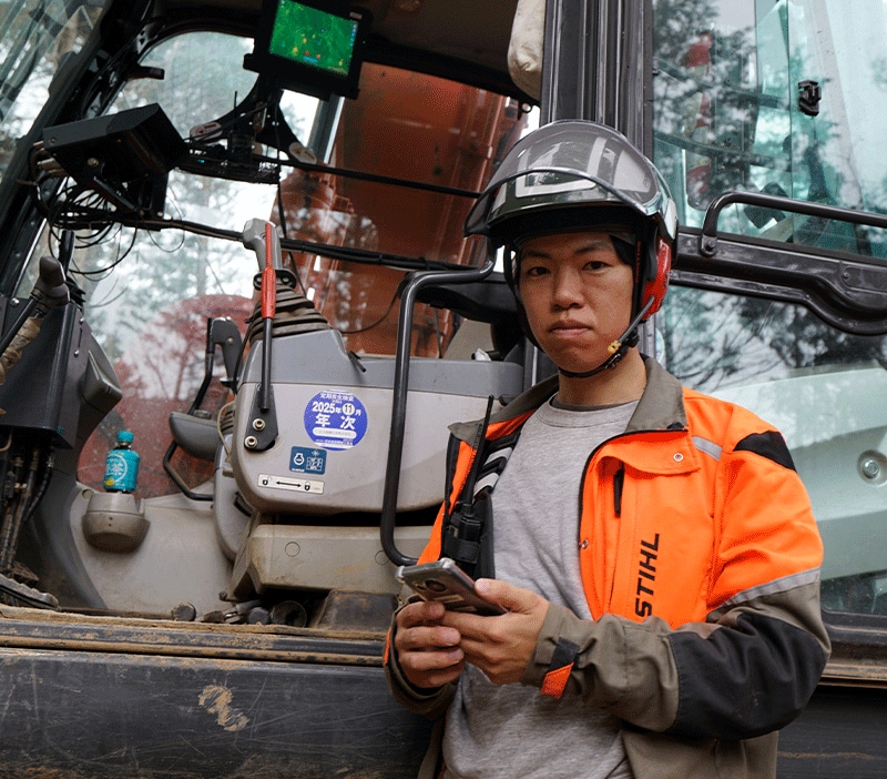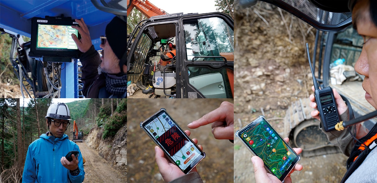 さらに重機にもSoko-co Forestシステムを搭載、JVCケンウッドの専用トランシーバーを介して、携帯電話の圏外でもタブレットやスマホなどの端末同士で位置情報の共有やチャットメッセージ、危険範囲への侵入警告などを実現している。