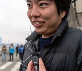 海岸に面し横に広く展開する運営現場と会場のライブ音声が混在する環境。