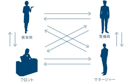 フロントと客室係、警備員などスタッフ同士がリアルタイムに情報共有しながら、各自の持ち場の業務に専念できます。