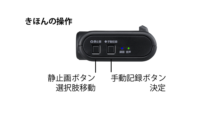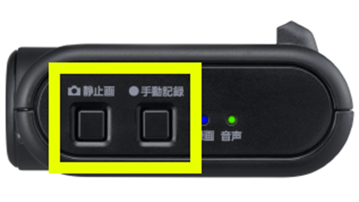 点滅表示が消灯したら、「静止画」ボタンと「手動記録」ボタンを同時に3秒長押しすると本機の電源がオンになります。
