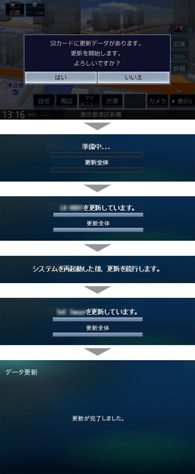 - アップデート中は、絶対にナビゲーションの電源を切らないでください(エンジンを切る、エンジンをスタートするなど)。またアップデート用SDカードの取り出しを行わないでください。正常に動作しなくなるなど、故障の原因になる場合があります。