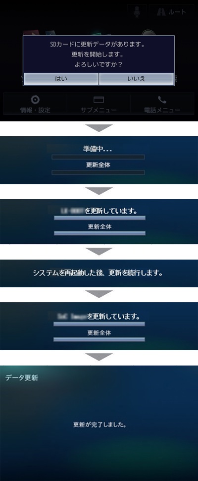- アップデート中は、絶対にナビゲーションの電源を切らないでください(エンジンを切る、エンジンをスタートするなど)。またアップデート用SDカードの取り出しを行わないでください。正常に動作しなくなるなど、故障の原因になる場合があります。