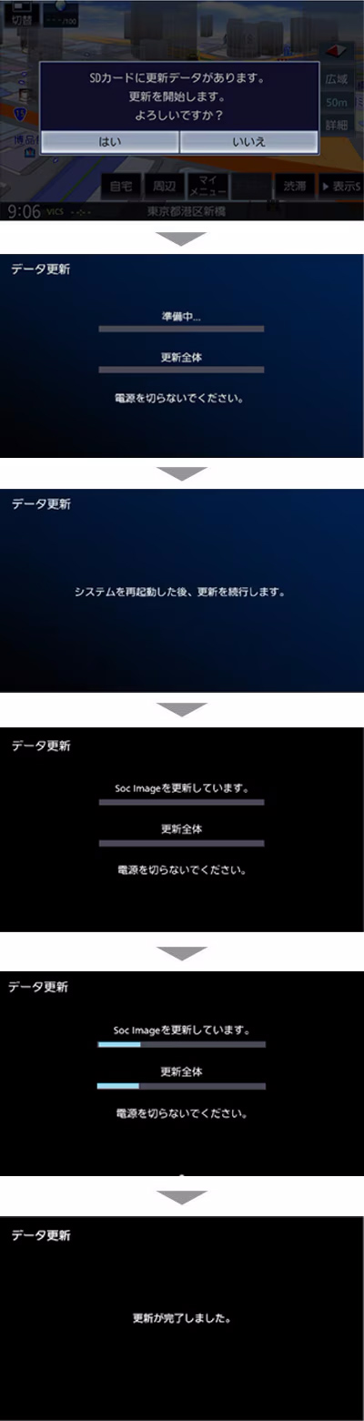 - アップデート中は、絶対にナビゲーションの電源を切らないでください(エンジンを切る、エンジンをスタートするなど)。またアップデート用SDカードの取り出しを行わないでください。正常に動作しなくなるなど、故障の原因になる場合があります。