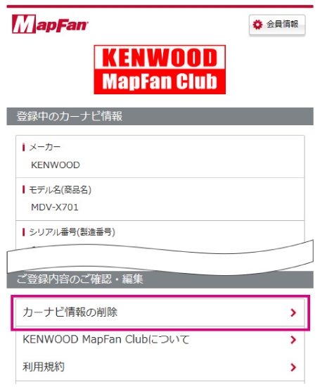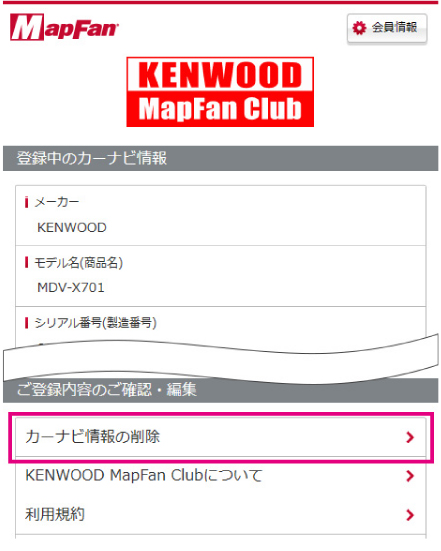 「KENWOOD MapFan Club」会員ページに戻ります。