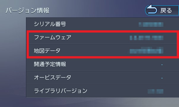 4)「ファームウェア」、「地図データ」のバージョンを確認する。