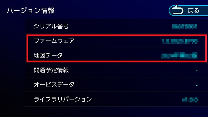 4)「ファームウェア」、「地図データ」のバージョンを確認する。