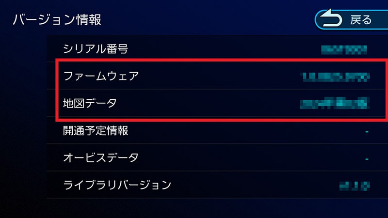4)「ファームウェア」、「地図データ」のバージョンを確認する。